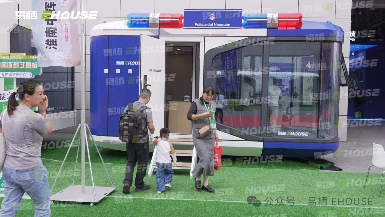展台上,一台线条流畅、科技感十足的智能太空舱成为全场焦点。其极具未来感的外观设计与精致的工艺细节,吸引众多参观者驻足拍照。与此同时,展区一侧陈列的模块化警务亭,则以务实干练的形象,展示了易栖产品在公共服务领域的应用拓展。