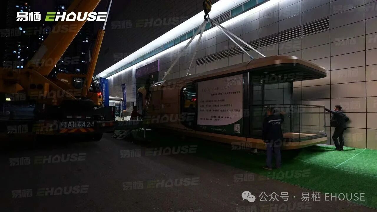 开展前夕,一台智能太空舱在合肥滨湖国际会展中心外广场完成现场吊装。整个过程高效流畅,从运输车辆卸货到吊装落位仅用时数十分钟,直观展现了易栖模块化建筑“快速部署、即落即用”的核心优势。这一幕被现场记录,成为易栖参展历程中的又一经典瞬间。